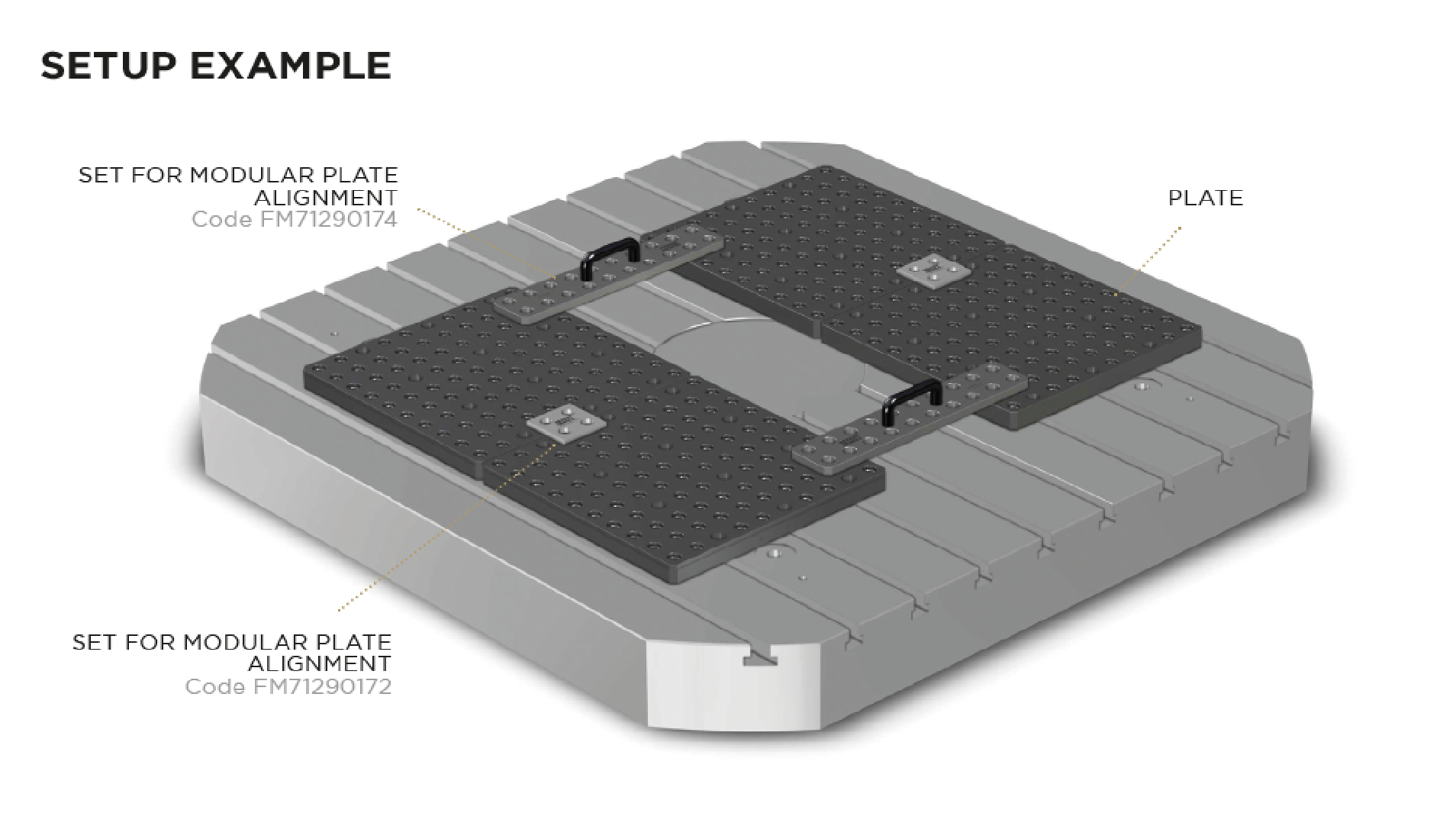 Alignment tool with conical bushings to maintain the exact 50 mm pitch between two adjacent Fast Mill modular plates.
