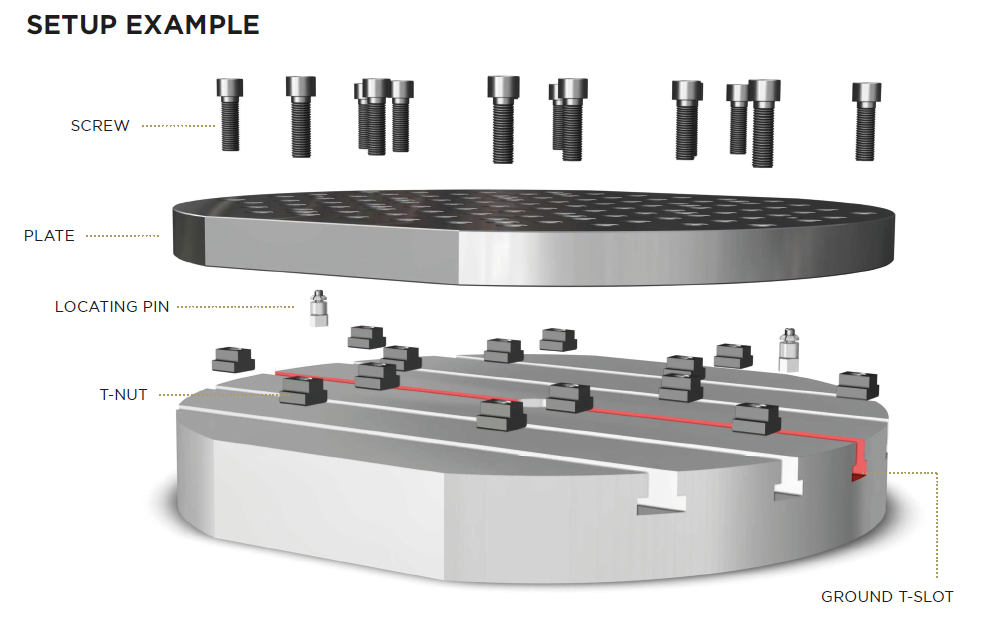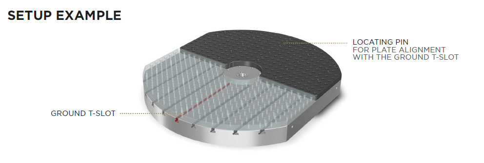 The locating pin ensures the correct alignment of a FastMill plate mounted on a machine table having at least one ground slot.