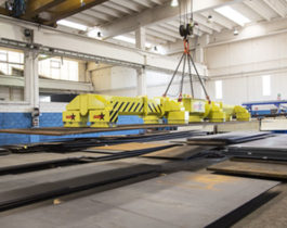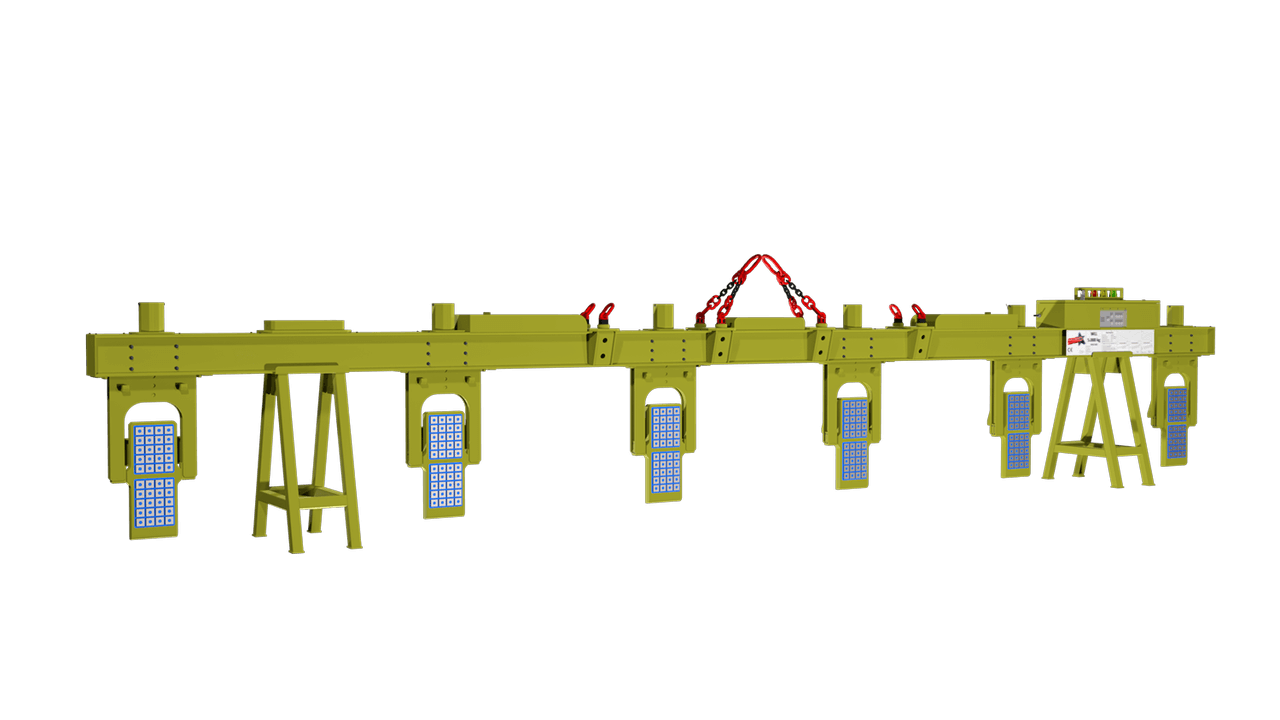 The electro-permanent telescopic beams of the TRETEL series have been designed to handle large sheet metals of any thickness, lifting the load from above without deformation or damage. The load remains clamped indefinitely with a constant force, limiting the energy consumption to the magnetic activation or deactivation cycles. They do not require the installation of buffer batteries, feature an “antiaccidental deactivation” system and extendible arms controlled by a hydraulic pump, and offer as well the possibility of selecting the modules to be magnetized according to the size of the load. Thanks to the provided
