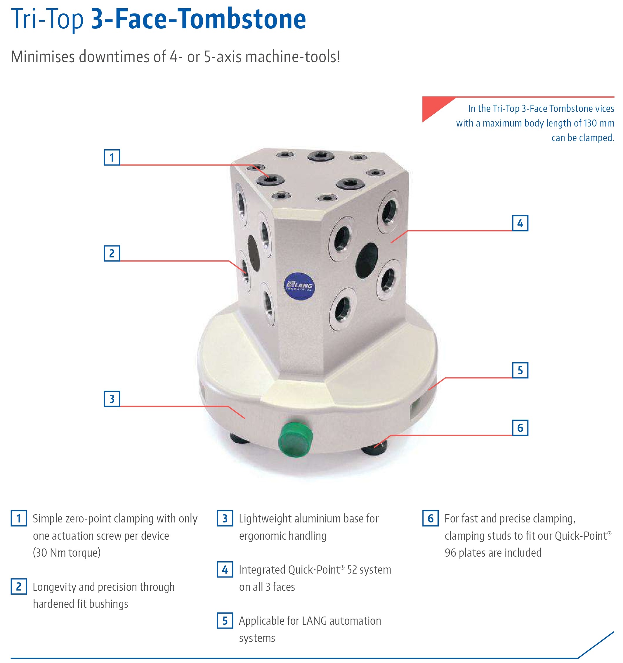 In the Tri-Top 3-Face Tombstone vices with a maximum body length of 130 mm can be clamped.