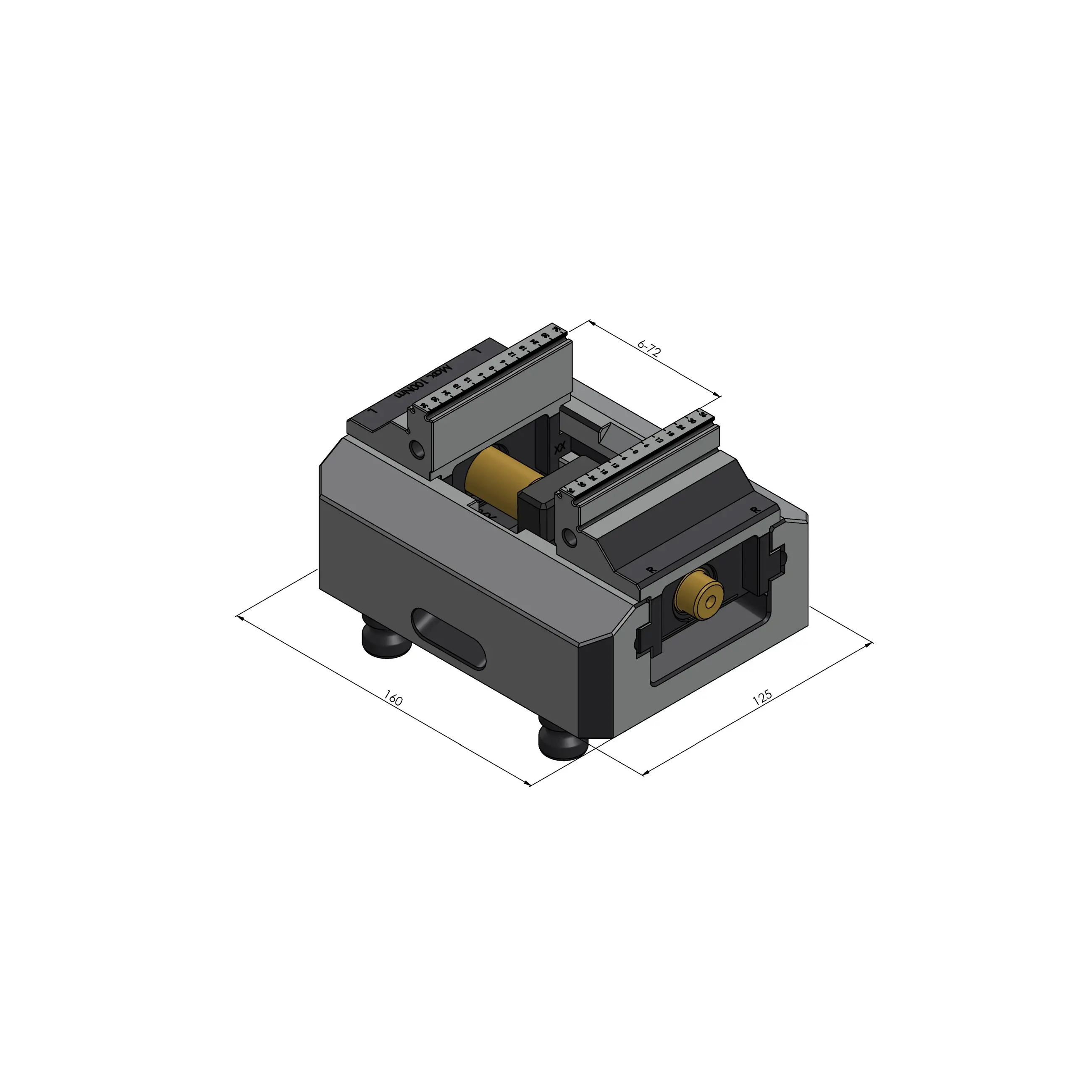 The most compact one among the „larger“ 5-axis vises from LANG Technik can realize a maximum clamping range of 155 mm using 77 mm clamping jaws. Like all Makro•Grip® 5-Axis Vises, it is equipped with four pull studs on its bottom side and is clamped directly in the Quick•Point® zero point clamping system. With its serrated clamping jaws, the centering vise holds the part by form-fit at a clamping depth of only 3 mm. Various additional surfaces also enable smooth clamping of the workpieces.